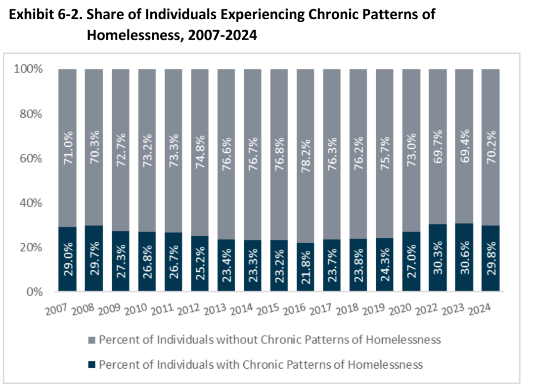 他还引用美国政府HUD的报告,说中长期(超过一年)的流浪汉只占12%,大部分人三个月内能重新找到住所,或者获得临时救济。但我查了最新的HUD报告,里面明明写的长期(chronic) 的无家可归者比例是30%,而不是12%。